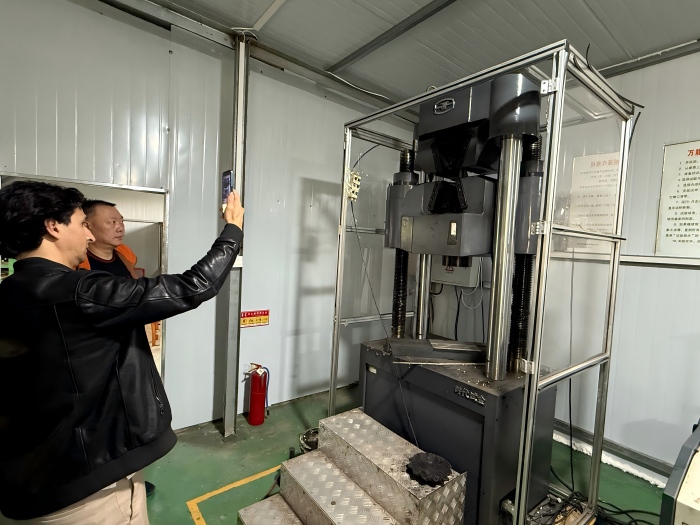 In addition, the customer visited the finished product packaging site and galvanizing workshop. Using a zinc meter, they measured the zinc coating thickness of each component, which averaged over 100 microns and met ASTM-A123 standards. The customer also observed our physical laboratory, which is used for quality inspections, and tested the tensile strength of Q355B steel.