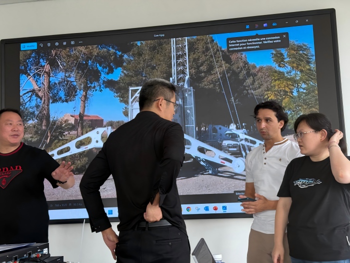 تُظهر الصورة ممثلين من مجموعة نيتس المغربية وهم يزورون خط إنتاجنا "خلية على عجلات" ويتفقدونه. ركّز العميل على خلية هيدروليكية بطول 30 مترًا على عجلات و ال خزانة اتصالات طوارئ بطول 12 مترًا وأعرب عن اهتمامه الأولي بالتعاون.